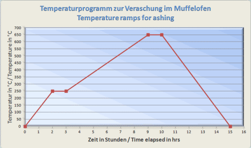 You need a programmable muffle furnace to incinerate the plastic components. A step-like incineration process is particularly important for long glass fibers. These can break due to the heat stress during incineration. We recommend the following step program.